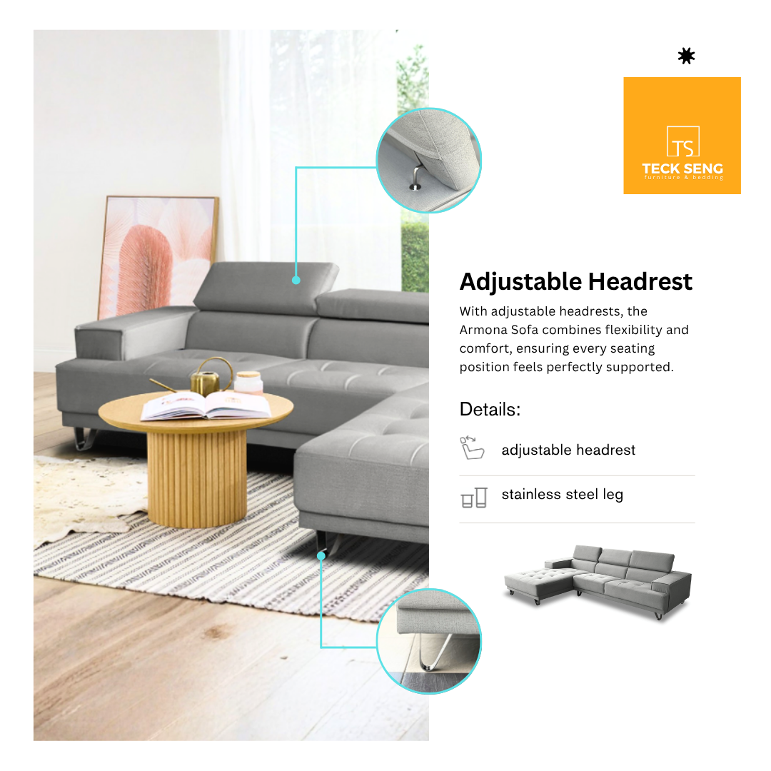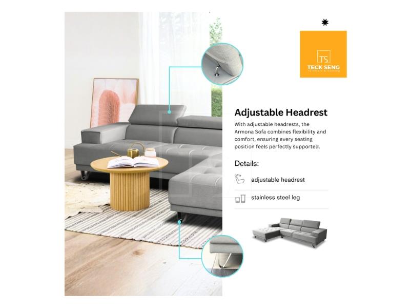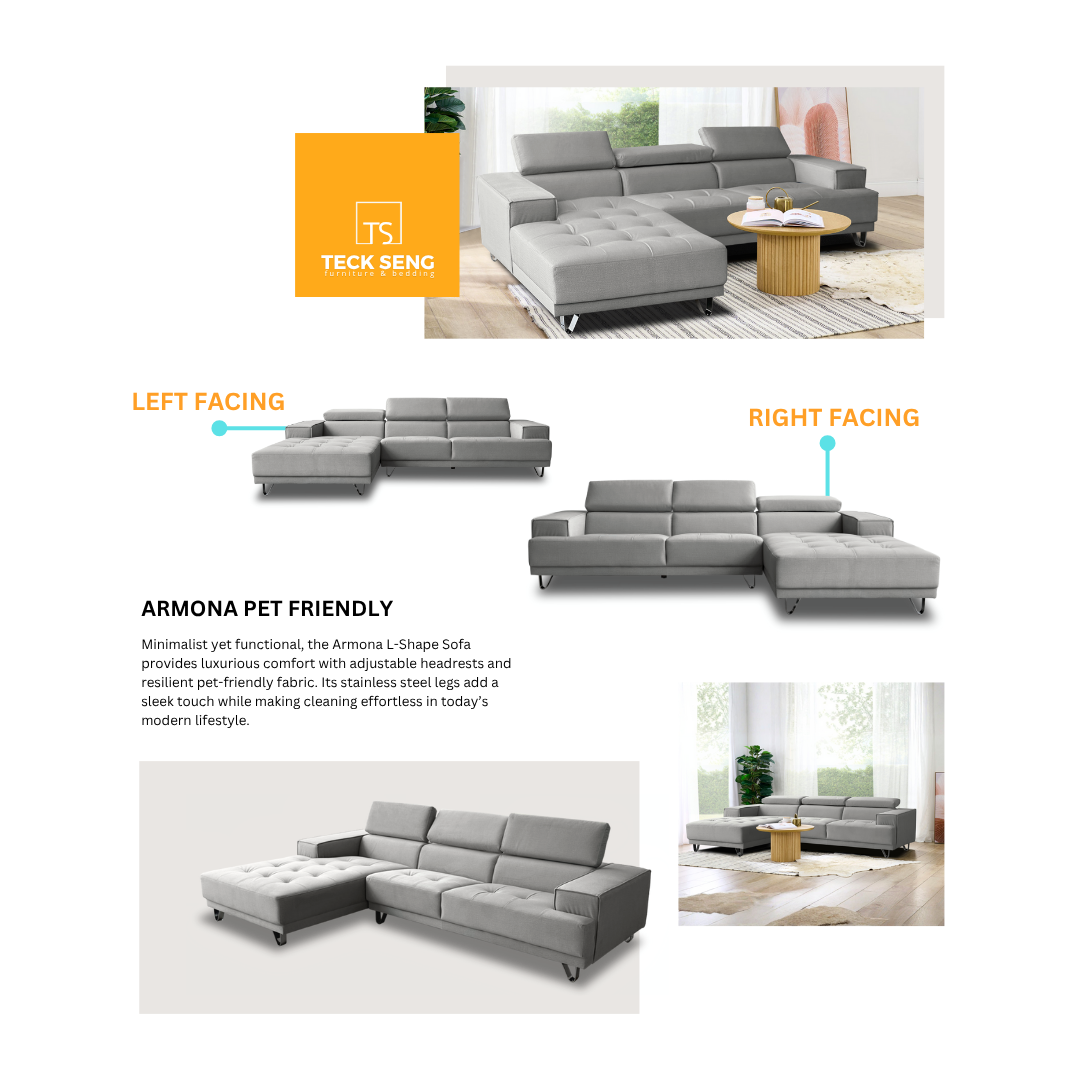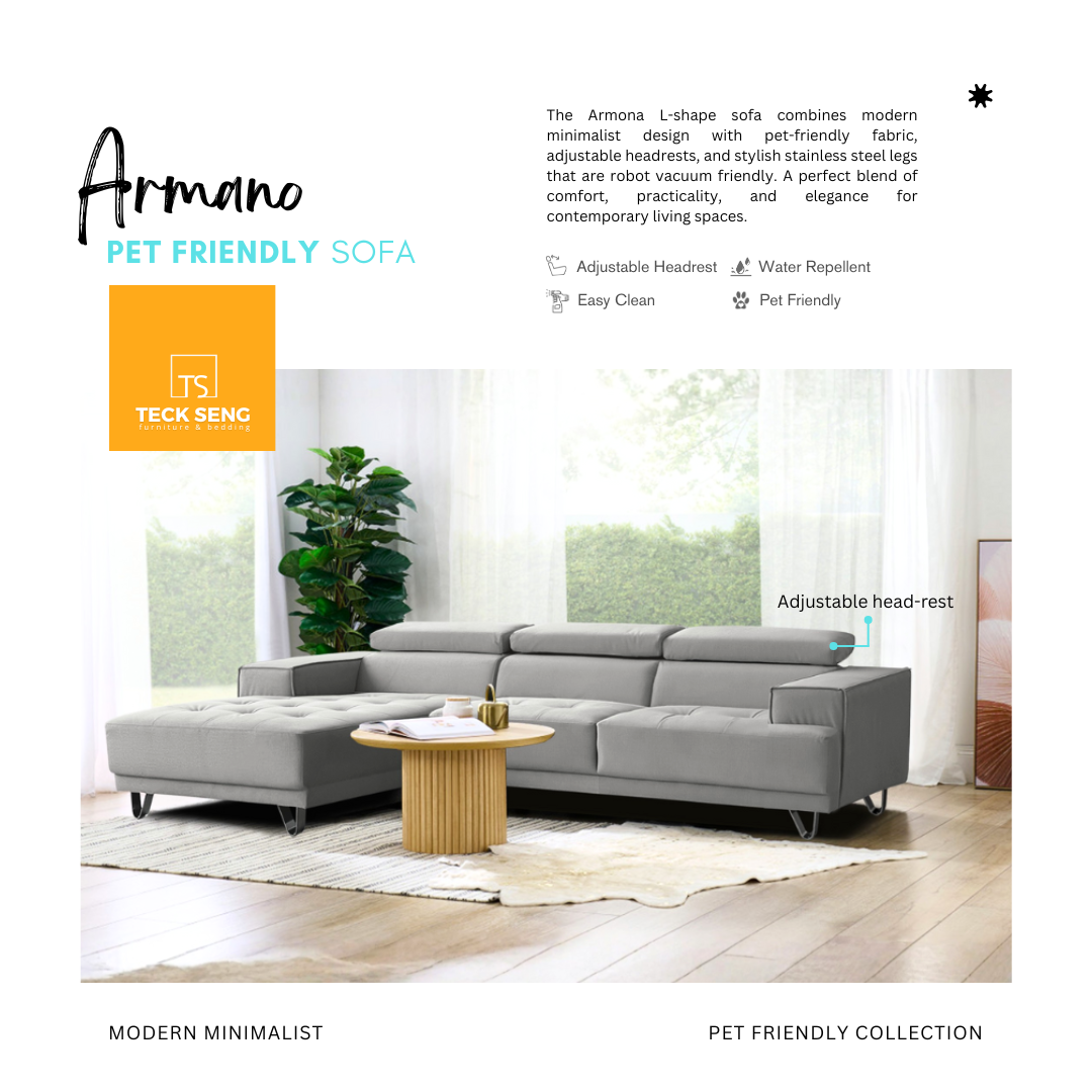 The Armona L-Shape Sofa blends modern minimalist style with everyday practicality. Upholstered in pet-friendly fabric, it features adjustable headrests and sleek stainless steel legs, ensuring durability, easy cleaning, and robot vacuum accessibility for hassle-free living.