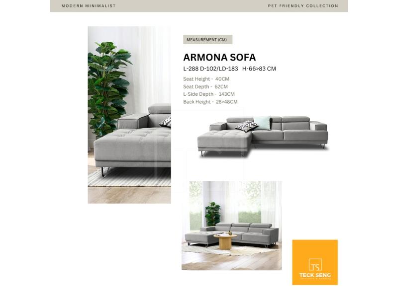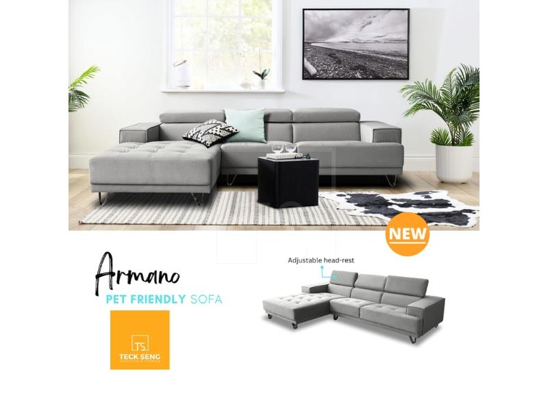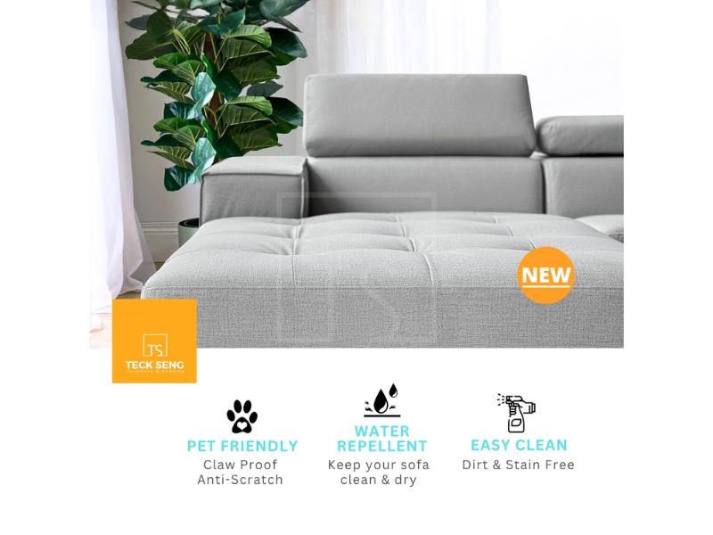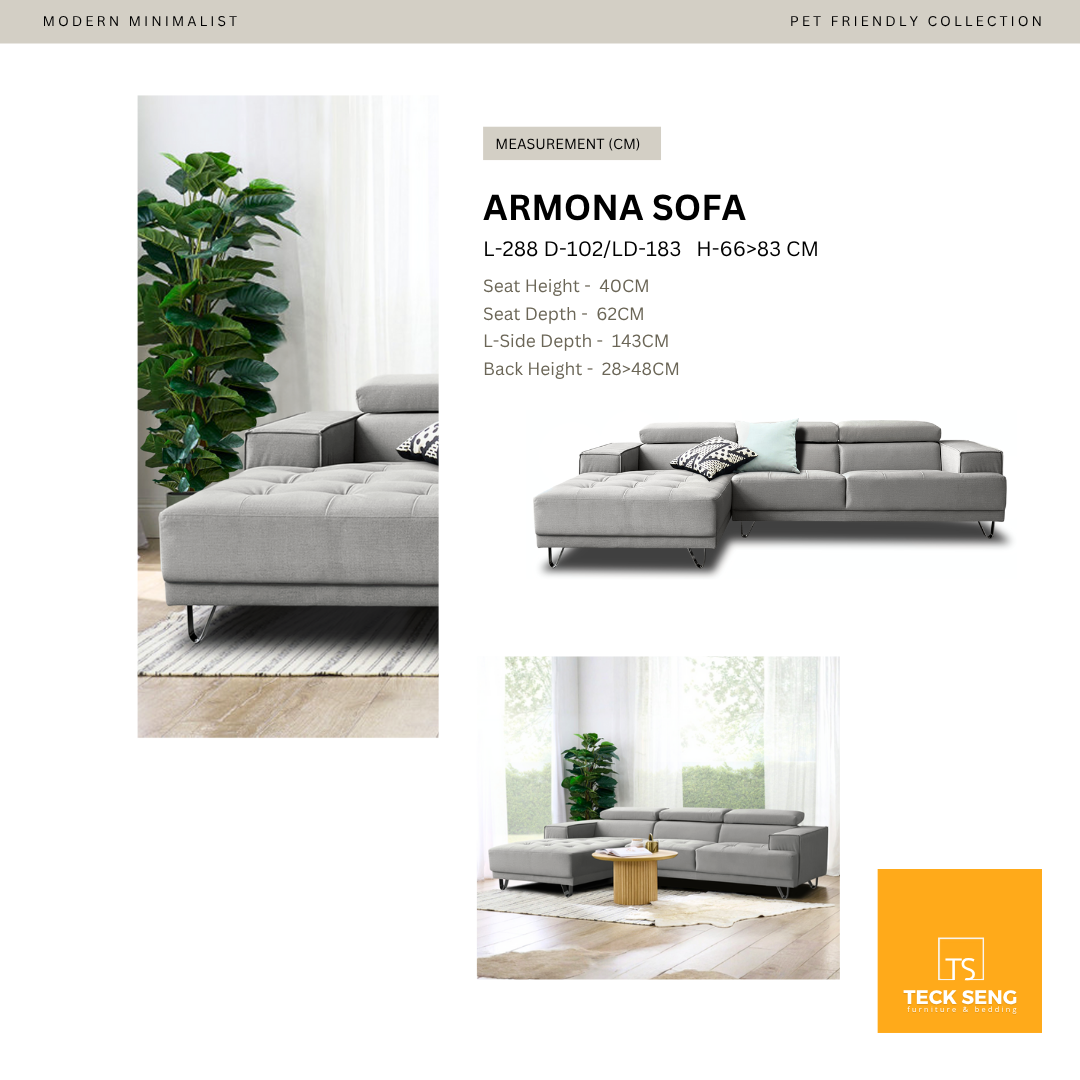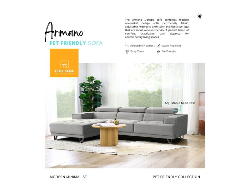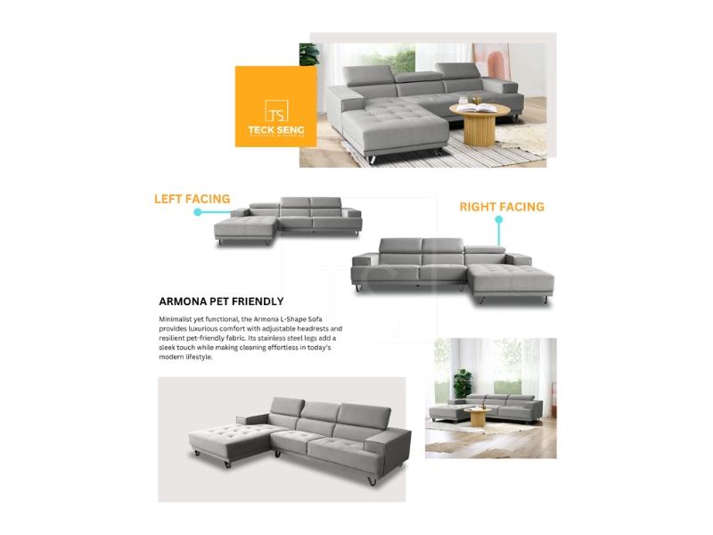 The Armona L-Shape Sofa blends modern minimalist style with everyday practicality. Upholstered in pet-friendly fabric, it features adjustable headrests and sleek stainless steel legs, ensuring durability, easy cleaning, and robot vacuum accessibility for hassle-free living.