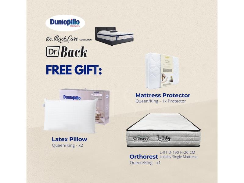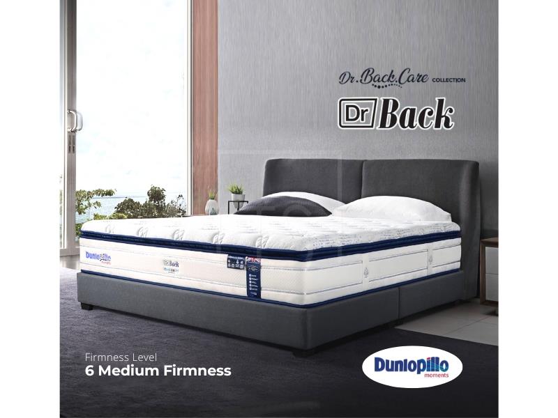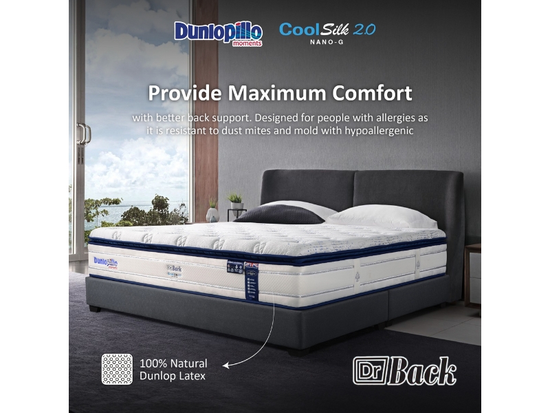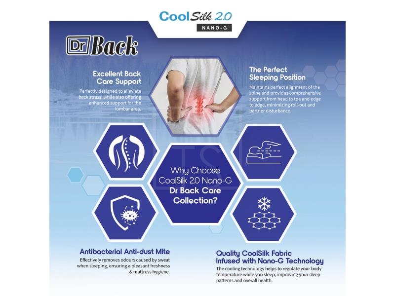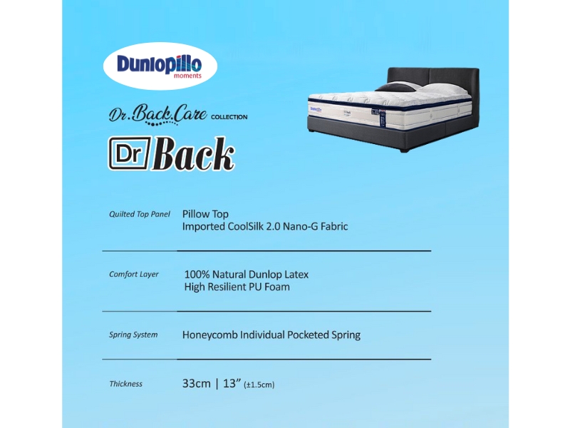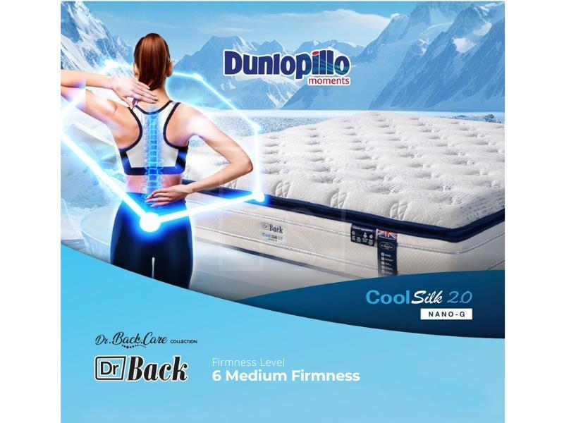 The Dunlopillo Dr. Back mattress is designed for superior back care, featuring CoolSilk™ 2.0 Nano-G fabric, 100% Natural Dunlop Latex, and a Honeycomb Pocketed Spring system for balanced support, cooling comfort, and long-lasting durability.