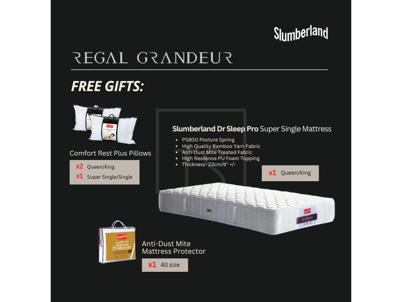 “Experience grandeur in every night’s rest.” The Slumberland Regal Grandeur mattress combines a Box Top design with Ticking Ritz Grandeur fabric, QuadroFlex Hybrid Spring + Pillow Spring system, Latex, Blue Gel Memory Foam, and multiple foam layers to deliver medium comfort, cooling relief, and luxurious support.