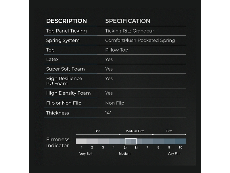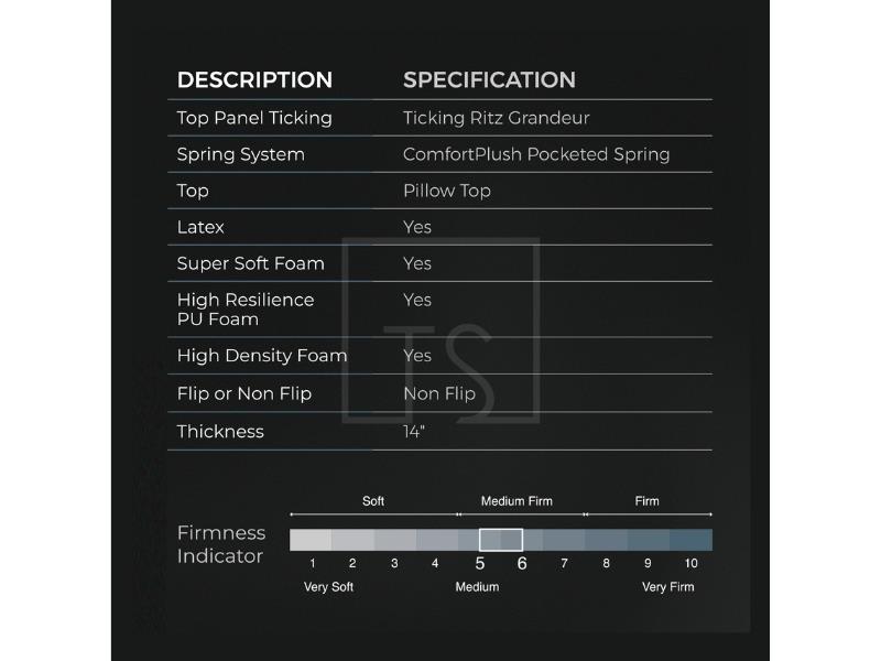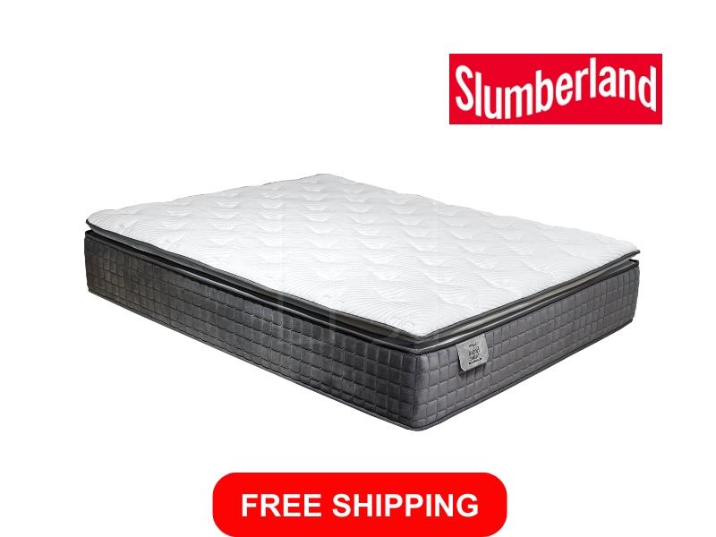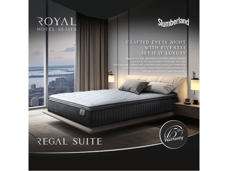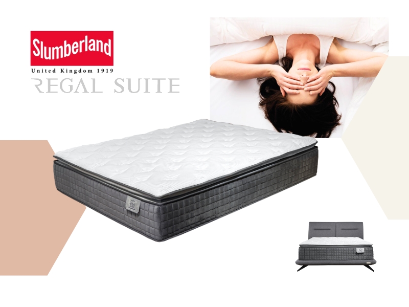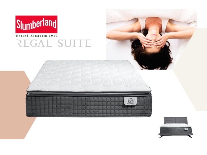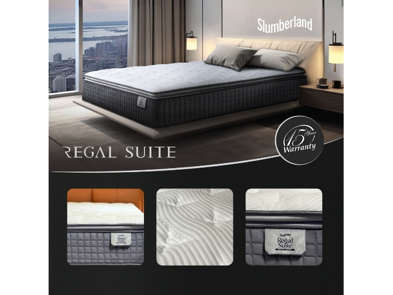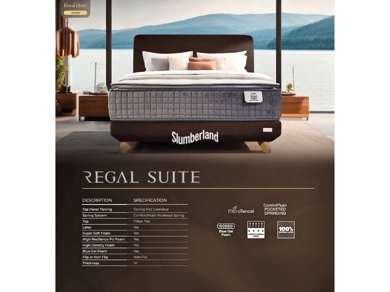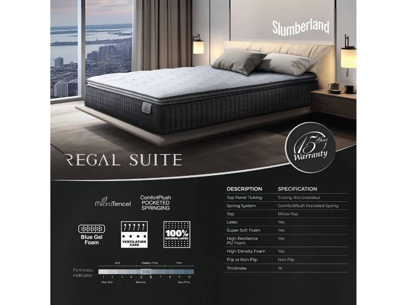 The Slumberland Regal Suites mattress features a Pillow Top with Ticking Ritz Grandeur fabric, ComfortPlush Pocketed Spring system, and layers of Latex, Super Soft Foam, High Resilient PU Foam, and High Density Foam for medium-firm comfort and lasting support.
