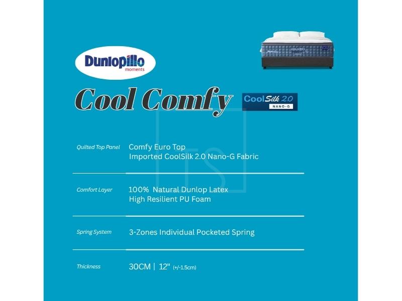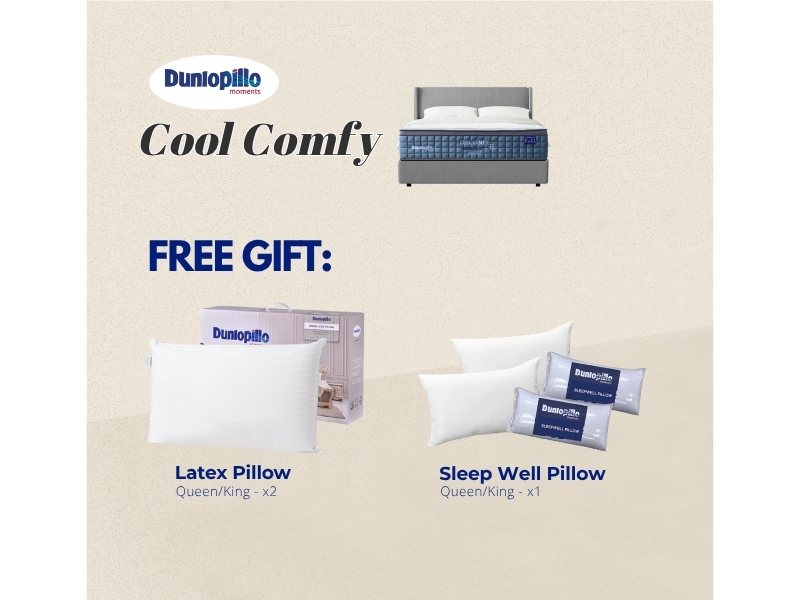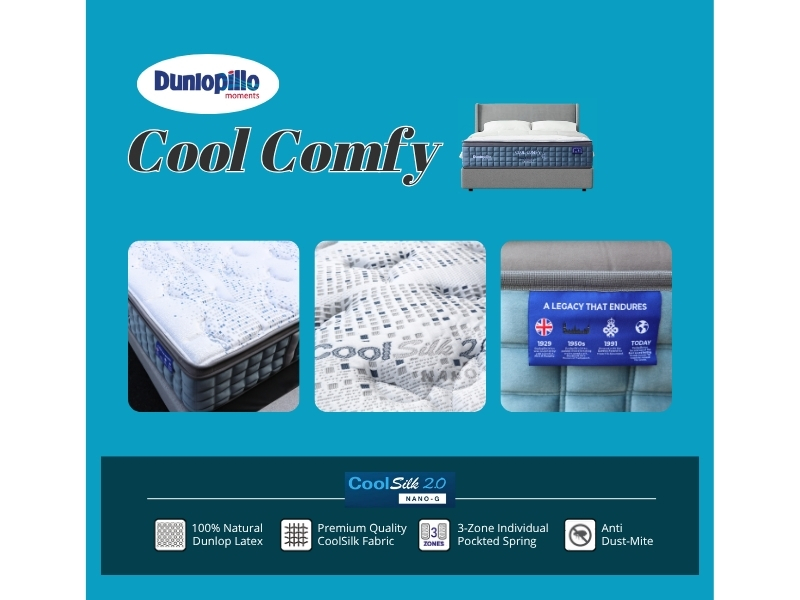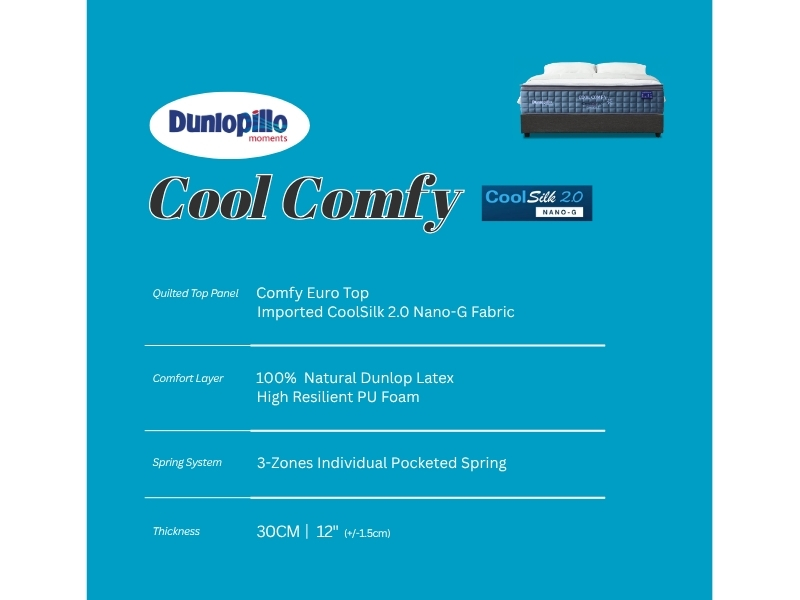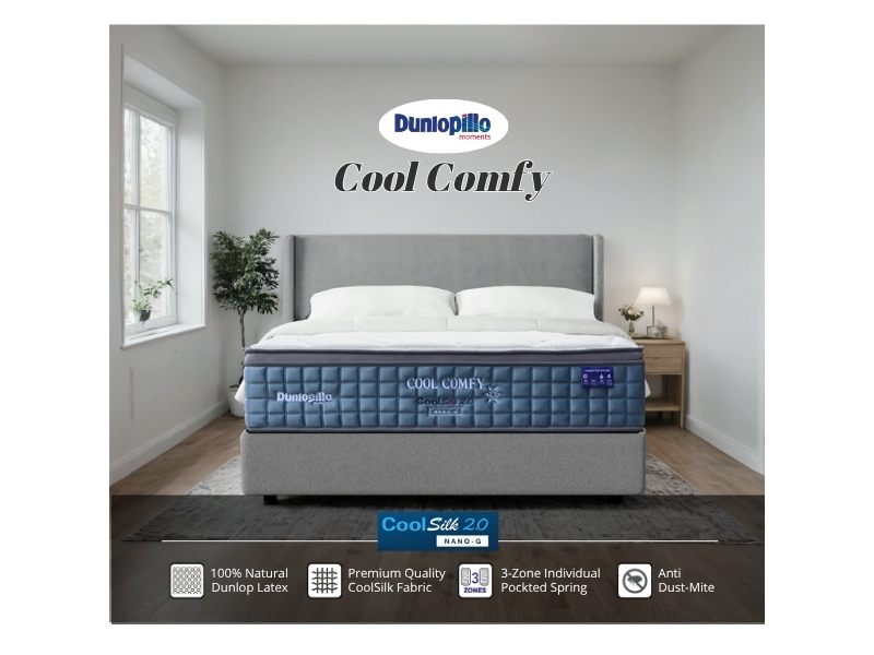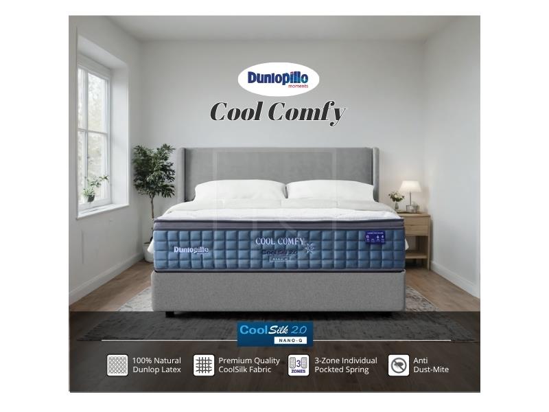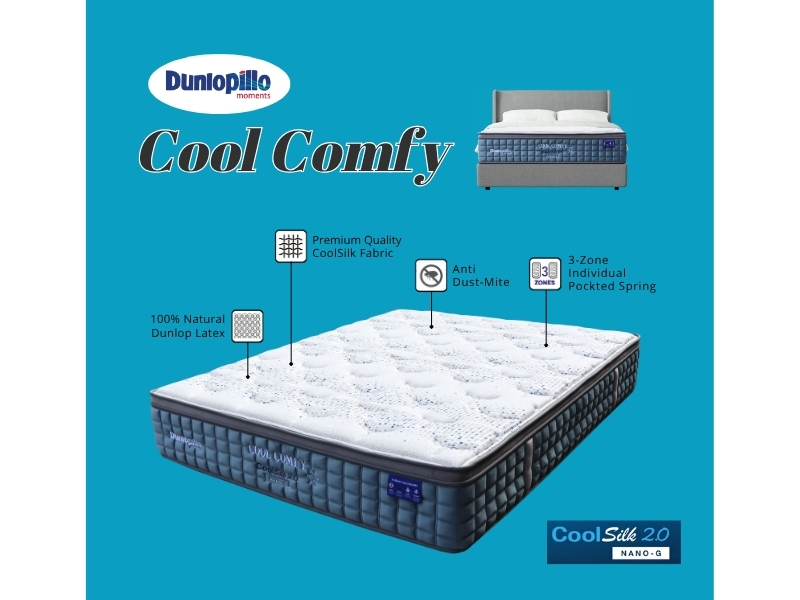 The Dunlopillo Cool Comfy mattress combines CoolSilk™ 2.0 Nano-G fabric, 100% Natural Dunlop Latex, and High Resilient PU Foam with a 3-Zone Pocketed Spring system, delivering refreshing cool comfort, balanced medium-firm support, and lasting durability.