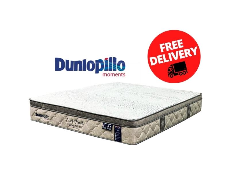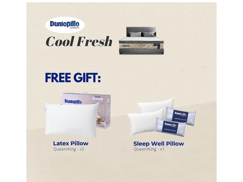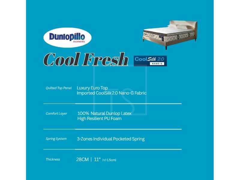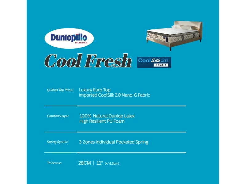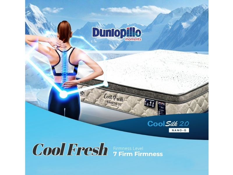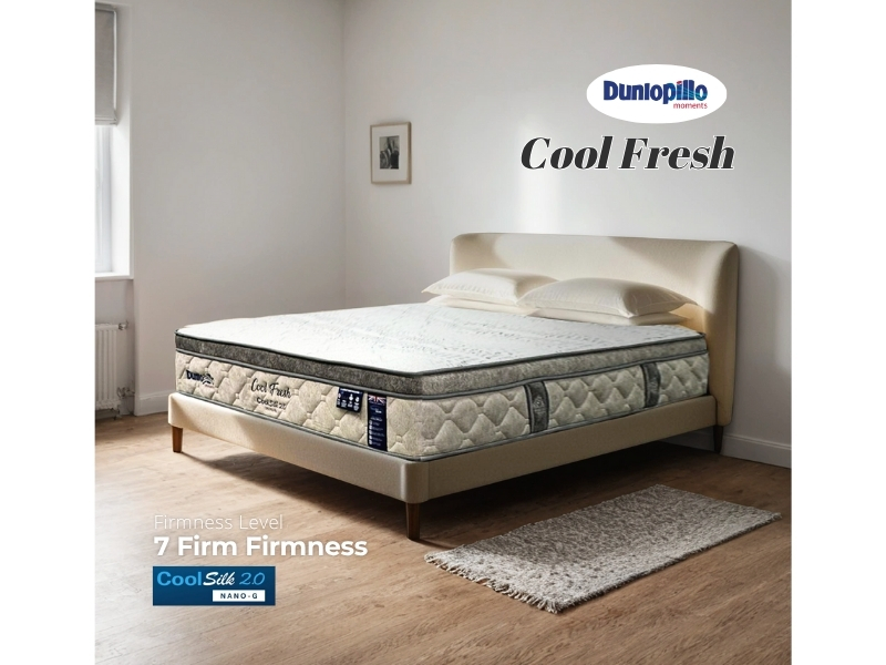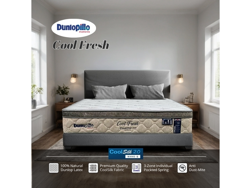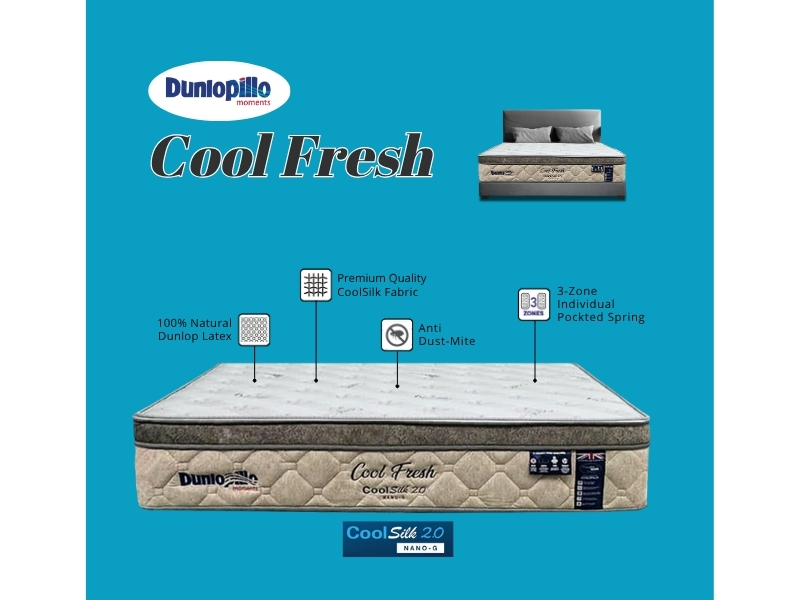 The Dunlopillo Cool Fresh mattress combines CoolSilk™ 2.0 Nano-G fabric, 100% Natural Dunlop Latex, and High Resilient PU Foam with a 3-Zone Pocketed Spring system, delivering refreshing cool comfort, balanced medium-firm support, and lasting durability.