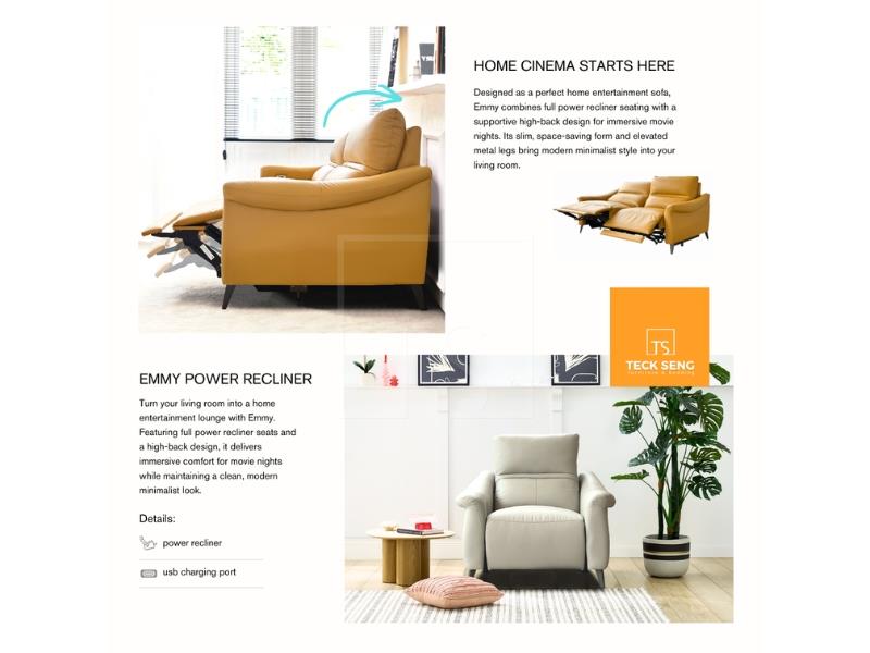 Designed for modern living, Emmy combines sleek minimalist styling with everyday comfort. Featuring slim arms to save space, a high-back design for superior support, and power incliner seating for every seat, it delivers the perfect balance of style and relaxation.