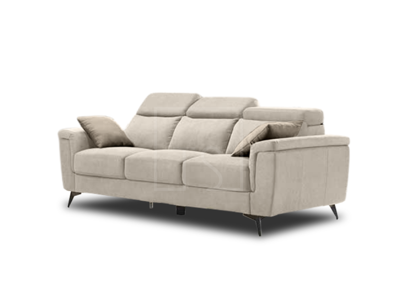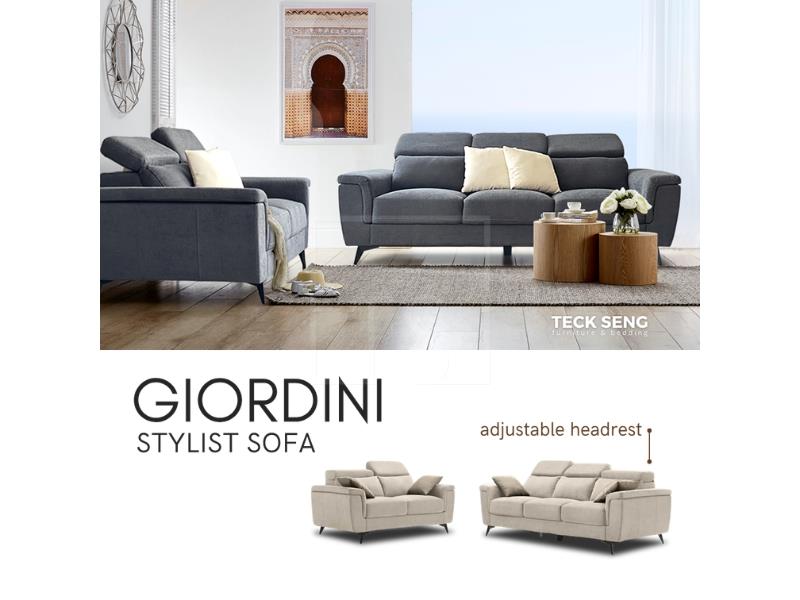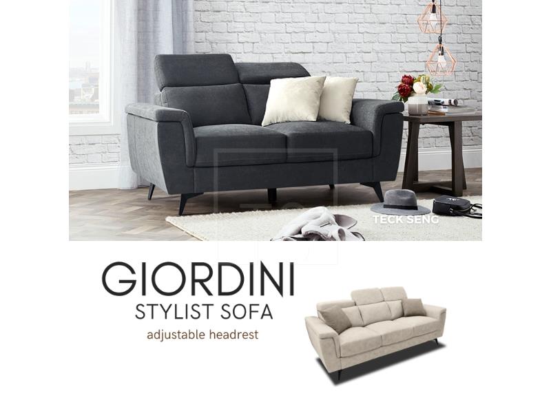 The Giordini Sofa in trendy water repellent fabric, features adjustable headrests, giving you just the right level of support for your full body comfort. Beautifully design with modern metal high legs and clean contoured lines, stylist yet comfortable and crafted with care.